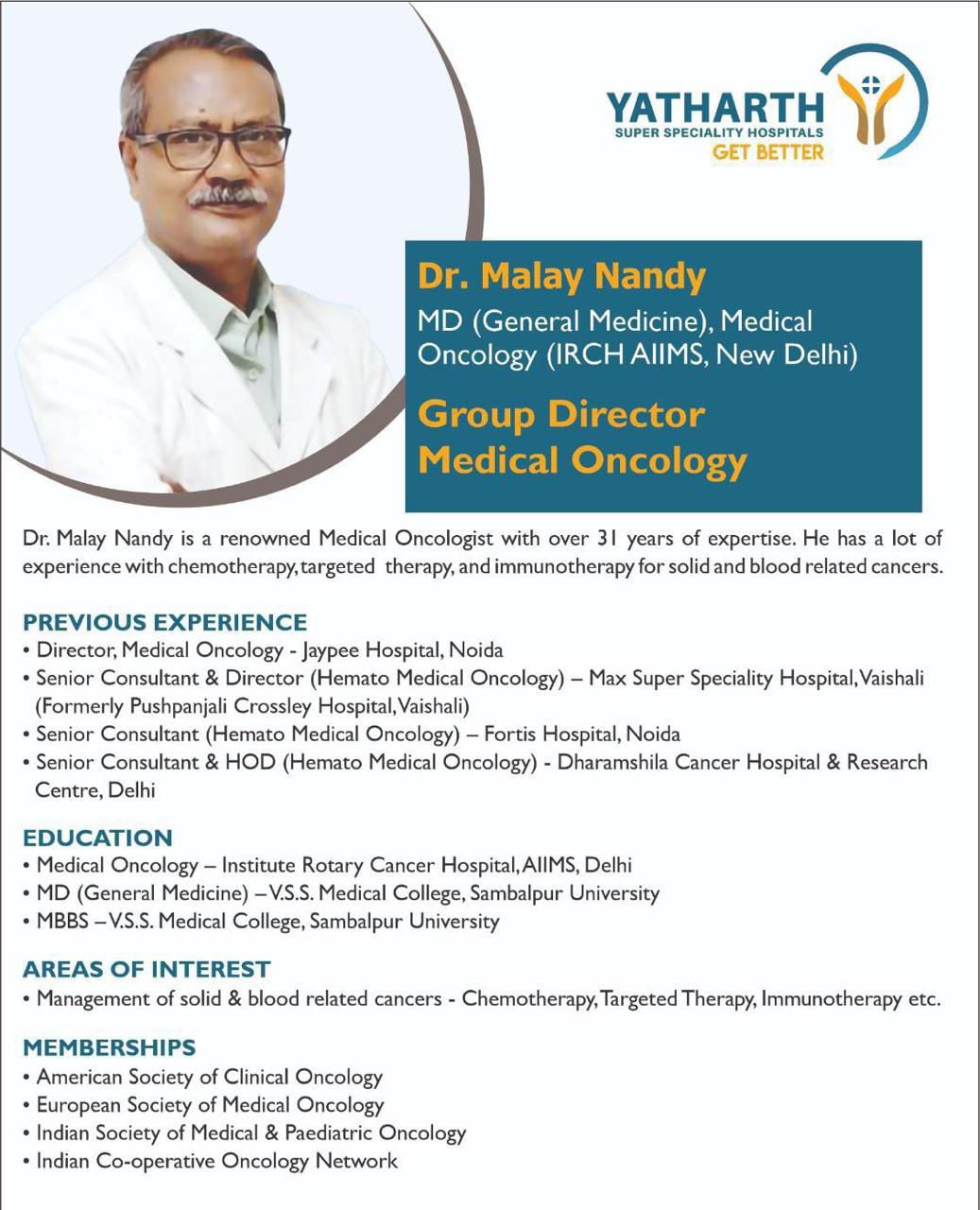 MD (General Medicine), Medical Oncology (IRCH AIIMS, New Delhi), Group Director – Medical Oncology, Yatharth Super Speciality Hospitals